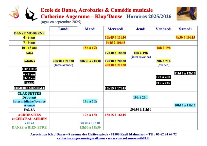 Horaires 2025/2026 et tarif Klap'Danse